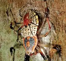 Herennia multipuncta, commonly known as the ornamental tree trunk spider, is a species of spider in the family Araneidae native to Asia.[1] It exhibits sexual dimorphism, the female being much larger than the male. It weaves a small web on the trunk of a tree or the wall of a building and is well camouflaged by its dappled colouration.