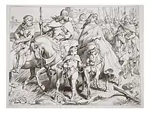 The epithet "the Wake" (Old English 'wæcnan') is first attested in the late 14th-century Peterborough Chronicle, ascribed by its first editor, Joseph Sparke, to the otherwise unknown John of Peterborough.[29] There are two main theories as to the origin of the tag. The usual interpretation is that it means "the watchful".[30] In Charles Kingsley's novel, Hereward acquires it when, with the help of his servant Martin Lightfoot, he foils an assassination attempt during a hunting party by a group of knights jealous of his popularity.[31] A second theory is that the name was given to him by the Wake family, the Norman landowners who gained Hereward's land in Bourne, Lincolnshire, after his death, to imply a family connection and therefore legitimise their claim to the land. The family claimed descent from Hereward's daughter by his second wife, Alftruda.[32] Within the Gesta, Hereward is instead given the epithet 'outlaw'.