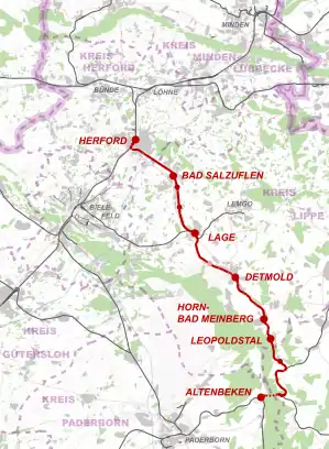 The line was built in 1880 by the Cologne-Minden Railway Company (Köln-Mindener Eisenbahn-Gesellschaft, CME) branching off its trunk line between Bielefeld and Minden. Construction started in Herford and followed the easy course of the Werre river uphill. On 31 December 1880, the line was initially opened for freight only and only as far as Detmold.[2][3]
