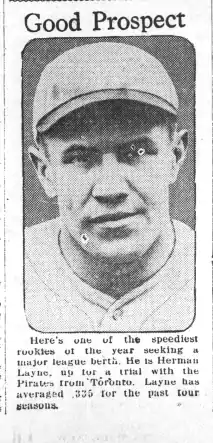 Herman Layne (February 13, 1901 – August 27, 1973) was an outfielder in Major League Baseball. He played for the Pittsburgh Pirates in 1927. He was married to the late Norene (Fisher) Layne and had one daughter, Enid Adams, one grandson, Bruce Adams and two great-grandchildren Michael and Lori. [1]