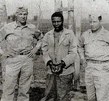 ![]() Major Earl O. Cullum (left) and Capt. Joseph J. Armand (right) with Herman Perry (center) after the manhunt | |