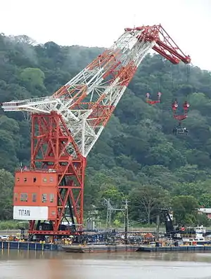 Titan, better known by its former nickname Herman the German (US Navy designation YD-171), is a large floating crane currently serving in the Panama Canal performing heavy lifts for lock maintenance. Prior to its move to Panama in 1996, the crane was based at the Long Beach Naval Shipyard from the end of World War II until the yard's closure in 1995. It was seized from the German Kriegsmarine following the end of World War II as part of war reparations. The crane was built by Demag Cranes AG as Schwimmkran nr. 1 in 1941 for the Kriegsmarine, where it had served in the Baltic Sea tending German U-boats.[1][2] MMSI number: 374940000