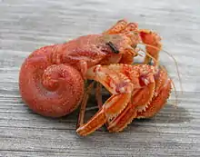 Hermit crabs are anomuran decapod crustaceans of the superfamily Paguroidea that have adapted to occupy empty scavenged mollusc shells to protect their fragile exoskeletons.[1][2][3] There are over 800 species of hermit crab, most of which possess an asymmetric abdomen concealed by a snug-fitting shell. Hermit crabs' soft (non-calcified) abdominal exoskeleton means they must occupy shelter produced by other organisms or risk being defenseless.
