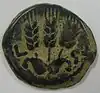 Agrippa I was the son of Aristobulus and Berenice, and was a grandson of Herod the Great. Agrippa spent much of his boyhood at the Imperial court in Rome. His friend, the Emperor Caligula, granted him the former territories of his uncles Herod Philip II and Herod Antipas. The Emperor Claudius later also added Judaea. The most common prutah issued by Agrippa I shows a royal fringed umbrella-like canopy on the obverse, with the inscription 'ΑΓΡΙΠΑ BACIΛEΩC' ('King Agrippa') in Greek, while the reverse shows three ears of barley between two leaves with the year. All the other coins of Herod Agrippa I contain graven images, with portraits of the Emperor or even of Agrippa himself. A very rare issue has a portrait of Agrippa with his son Agrippa II on horseback.[8]