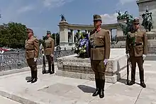 At the front of the monument is the Memorial Stone of Heroes (Hősök emlékköve), a large stone cenotaph surrounded by an ornamental iron chain. The cenotaph is dedicated "To the memory of the heroes who gave their lives for the freedom of our people and our national independence." While some guide books refer to this as a tomb it is not a burial place but is erroneously referred as the "Tomb of the Unknown Soldier". Hungary has no Tomb of the Unknown Soldier unlike most European countries, nor any memorial to the unknown fallen of wars. No human remnants are interred here, there is only an artesian well under the tombstone-like memorial. The Memorial Stone of Heroes was originally erected in 1929 as a tribute to those who died defending Hungary's 1000-year-old borders. It was removed in 1951 as its message was politically unacceptable for the Communist regime. The current one was built at the same spot in 1956. The memorial is surrounded by a fence and it is off limits for visitors. The Ministry of Defence only opens the gate for foreign dignitaries and official state ceremonies.