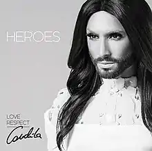 Musically "Heroes" is a departure from Wurst's operatic pop style known from former singles like "Rise Like a Phoenix" or "That's What I Am". The composition still incorporates orchestral and classical elements but in a more minimal way. In contrast, the percussion elements are stronger than in her previous work. The song is mainly built of elements from baroque pop combined with parts of soul pop and world beat. Wurst pointed out that "Heroes" has invented a wholly different genre: "Ein ganz anderes Genre".[1] It lasts for 3:43 minutes with support by a backing choir. Wurst called the song "... cooler than I thought I could sound like".[1] The themes of "Heroes" are love, self empowerment and the battle against intolerance through the use of phrases such as, "Love is like a battle cry and we'll shine till our colours light up the sky and we'll dance to the sound of our battle cry".[2] "Heroes" was released with significant anticipation from fans and the media[3] on 8 November with its first live performance on Wetten, dass..? in Graz. The release date occurred two days before her birthday: "Conchita Wurst has released 'Heroes', bringing to an end months of anticipation for her countless fans around the world. The song comes two days after her birthday, when she published a video thanking her fans for their support and talking about the song. It was directly made available to stream on multiple platforms.[4] On November 8, she also released the lyric video on YouTube.[5] Wurst proceeded to begin work on an album influenced by "mature ladies" like Cher, Shirley Bassey, and Tina Turner.[6]