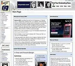 Heroes Wiki was launched on October 10, 2006, several weeks after Heroes premiered in North America. Content includes articles on episodes, characters, cast and crew, cultural references, along with interviews with members of the Heroes cast and crew.[8] Episode spoilers and user-contributed theories was permitted on certain areas within the wiki.[9][10] The site's main page featured upcoming Heroes events and news, and links to articles summarizing the latest Heroes episode and online content. There are also links to Heroes-related websites, including official websites affiliated with the show and its producers, websites used in Heroes Evolutions, and unofficial fan sites. On September 18, 2008, the site became WAP-enabled for cell phones and other mobile devices.[11]