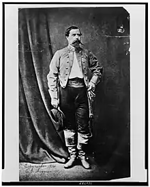 Von Borcke brought with him a massive Solingen straight sword, which would become famous during his ensuing career.[2] By the end of the month, he had made his way to Richmond, capital of the Confederate States. He was given the rank of captain in the Provisional Army of the Confederate States on June 1 of that year and assigned to Major-General J. E. B. Stuart by the order of Secretary of War George W. Randolph.[3] Von Borcke was conspicuous on the battlefield for his large height and girth and the extremely large sword he wielded, became known as the "giant in gray."