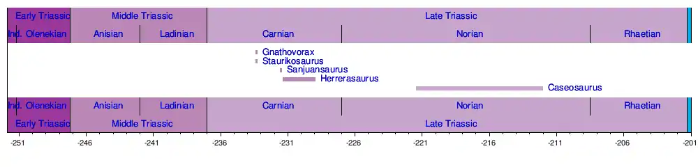 | Herrerasaurids Temporal range: Late Triassic (Carnian), Possible Late Norian records if Chindesaurus and Caseosaurus are part of the family. | |