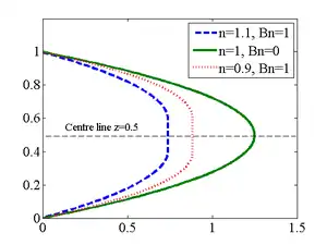 A frequently-encountered situation in experiments is pressure-driven channel flow [6] (see diagram). This situation exhibits an equilibrium in which there is flow only in the horizontal direction (along the pressure-gradient direction), and the pressure gradient and viscous effects are in balance. Then, the Navier-Stokes equations, together with the rheological model, reduce to a single equation: