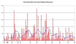In April 2009, his sixteen One Day International innings since the March 2008 one-day series in Bangladesh having yielded just three fifties, even Stuart Hess, his most ardent media supporter, was moved to cast doubt over his future. Hess had famously recommended Gibbs as captaincy successor to Shaun Pollock in 2003, but now, noting that his "average, as an opener, in that same period is 25.25, more than 10 runs below his overall average of 35.87", Hess felt "a sense that Gibbs is living off past deeds and not playing with the requisite form needed to hold on to a national spot."[15] He noted, however, that Gibbs was the only South African with more than 1,000 World Cup runs and that, of the twelve others, only Sachin Tendulkar with 57.93 and Sir Viv Richards with 63.31 had better averages: