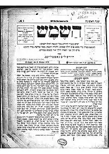 Under his own name, Gottlieb was also a famous translator, journalist and editor of newspapers in Sziget and Kolomyia (now in Ukraine). He founded what was effectively the first Hungarian weekly in Hebrew in 1878[3] in Sziget called "The Sun" (השמש).[4] As of 1887, after having been expelled by Rabbi Chananyah Yom Tov Lipa Teitelbaum of Sziget, he continued to publish it, in Kolomyia, alternating between the two names HaShemesh (השמש) and HaCharsah to avoid an Austrian tax on weekly newspapers.[5] He also published from 1893 to 1913 his "Jüdische Volkszeitung" (ייִדישע פאָלקסצײַטונג), Jewish People's Paper in Yiddish, from 1902 to 1914 his weeklies, Zion and Love of Zion (Ahavat Tzion אהבת ציון, together with Elijahu Blank) a bilingual Hungarian-Yiddish official Zionist newspaper,[6] as well as his monthly "Die Wahrheit" (The Truth) in Hebrew in 1896.[1] "Zion" is considered as the first Hungarian Zionist newspaper, which was sponsored by Theodor Herzl.[7]