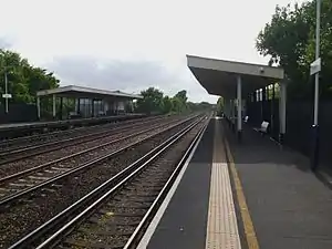 Entrance to the station is from either side of the railway bridge which is above street level. The station entrances are at the southern end of each platform, and at the western end (furthest from London). The station has ticket machines and an office open until 1.40 pm. The main line towards Woking and Basingstoke consists of four tracks here, but only the outer tracks have platforms, served by stopping services to/from Woking.