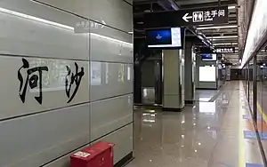 Hesha Station (Chinese: 河沙站; pinyin: Héshā Zhàn; Jyutping: ho4saa1 zaam6; lit. 'river sands') is a station on Line 6 of the Guangzhou Metro. It is located under Yuxian Road (育贤路) on the island of Datansha in the Liwan District of Guangzhou. It started operation on 28 December 2013.[1]