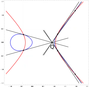 In algebraic geometry, the first polar, or simply polar of an algebraic plane curve C of degree n with respect to a point Q is an algebraic curve of degree n−1 which contains every point of C whose tangent line passes through Q. It is used to investigate the relationship between the curve and its dual, for example in the derivation of the Plücker formulas.