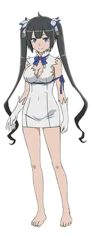 Hestia is depicted with blue eyes and black hair tied into twin ponytails. She usually wears a white mini-dress with a blue ribbon around her collar and another tied around her waist, back and arms, which has become the character's most defining feature.[1] She also wears a pair of white gloves and usually goes barefoot. Although petite, she has been nicknamed the "Loli Big-Boobs" (ロリ巨乳, rori kyonyū) for her large bust size, which makes some of her deity peers like Loki jealous.[LN 1] Unlike most other deities, Hestia is depicted as energetic and kind, if not slightly childish; and is also willing to form romantic relationships with a member of her Familia, being clearly infatuated with Bell.[LN 1] After descending to the Lower [human] World; Hestia was initially unable to recruit anyone into her Familia due to not being well known and looked down upon. After failing to recruit for the 50th time, she noticed Bell and decided to secretly follow him. She later found out that Bell had also been trying to enter a Familia, but was too repeatedly rejected. Hestia then took the chance to recruit him, which Bell happily agreed upon.[LN 1]