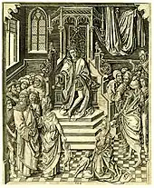 Testard has borrowed the composition for his Judgment of Solomon from Netherlandish printmaker Master FVB's c. 1480 engraving. He has made several slight alterations: the appearances of the faces and costumes in some of the crowd, minor architectural details, and a slightly lower viewpoint.