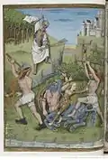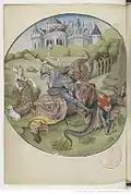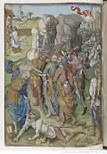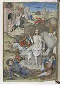 Testard has been influenced here by Netherlandish printmaker Master I. A. M. of Zwolle's Battle of Two Men with a Centaur, to which he introduces Death, a lion and a wild-woman.[8] Interpretation of this scene is problematic. Typically understood to represent a Centaur battling the Lapiths, a purely mythological tale and unusual subject for use in the "Office for the Dead", Belkin posits that this contest between man and beast is "symbolic of the struggle against dark forces. The Centaur and the wild woman form a single unit—the personification of vice in terms of Christian allegory. The private nature of the Book of Hours leads one to infer that Charles used the allegory of the struggle with the Vices for his own political vendetta against his rivals, conveying in this enigmatic miniature his bitter enmity towards those who had wronged him."[9] |