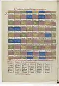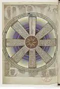 On the reverse of the Ave Maria is a diagram for calculating the date of Easter. Originally, "the vivid colours of the concentric circles behind the diagram must have stood out more clearly against the cream-coloured parchment [however] one of the components used to make the golden ground of the Ave Maria, probably silver, has gone rusty and seeped deep into the parchment". The main spoke, pointing up, features a sequence of nineteen Roman numerals representing years in the Metonic cycle.[11] |
