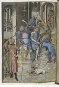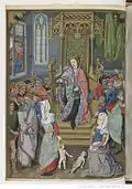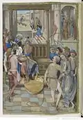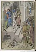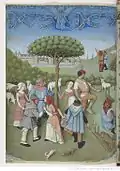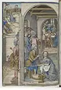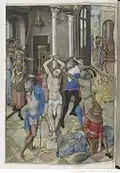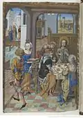 The composition of this scene is based upon a print by Master FVB. Testard has altered the faces, costumes and number of characters, introduced a lower viewpoint and made minor modifications to architectural details.[7] |