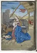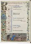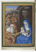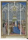 A book of hours is a manuscript designed for personal devotion and was popular in the Middle Ages. This illuminated work made for Charles, Count of Angoulême by the painter Robinet Testard is an unusual volume and is more comprehensive than just a set of devotions. The artist seems to understand his sponsor's character. As well as its devotional purpose, the book seems designed to entertain, to arouse curiosity (f. 52v), to amuse (ff 3r, 4v and 5r), to satisfy the sponsor's aesthetic sense (ff. 16v and 26v), to encourage his pastoral feelings (f. 20v), to encourage his chivalrous instincts (f. 2v) and even to flatter him (f. 41v).[2]