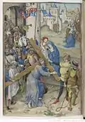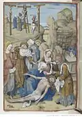 The folios most concerned with personal devotion, the Passion, Death and Resurrection of Christ (f. 106v), were in fact the work of the engraver Israhel van Meckenem, subsequently coloured by Testard with his characteristic luminous hues. Other work by painters such as Jean Bourdichon were included and may demonstrate Testard's honesty, his admittance that his talents were insufficient for the task. He also introduced some profane elements such as sexual encounters (ff. 4v and 20v), mythology (f. 41v) and chivalry (f. 53v). The text is entirely in Latin, and the book can be interpreted as being the antithesis of a book of hours, or even an anti-book of hours.[2]