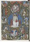 This miniature is adapted by Testard from an engraving by van Meckenem, itself a copy of an earlier 1466 print by Master E. S. The original print features John the Baptist in the centre, whom Testard has replaced with Christ amongst angels. Surrounding, the four symbols of the evangelists are arranged in a Latin cross: John's eagle (top), the winged lion of Mark (left), the bull of Luke (right), and Matthew's angel (bottom). The other medallions show the four doctors of the Church: Jerome with lion (top left); Gregory (top right), Augustine (bottom right), and Ambrose (bottom left). Testard largely keeps to original composition, which may have been a design for a paten. He has made some alterations to the faces and postures of the other characters, and added four prophets to the corners, skillfully extending and elaborating the foliate motifs to unify the image.[3][4] |