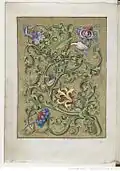 17 historiated letters on a background of gold which spell "Ave Maria, gracia ple[na]" from the first chapter of Luke. This is the reading for the Feast of the Annunciation (March 25) The first letter is copied from the alphabet of Master E. S. (itself inspired by the late-14th century pattern-book by Giovannino de' Grassi). Testard seems to have modeled the rest of the letters upon another woodblock alphabet of around 1464 from Flanders or the Netherlands.[10] |