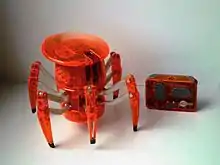 The Spider is a remote-controlled hexapod robot able to change direction by its head rotation. The head presses the leg joints into moving forward in the direction where the head is pointed. It is powered by three replaceable LR44 (AG13) Button cell batteries.[10]