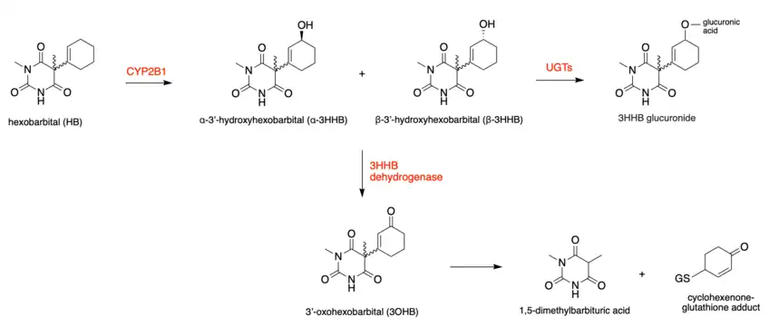 The hepatic metabolism of hexobarbital (HB) can be divided into different pathways all forming different metabolites.[19] The S(+) enantiomer of HB preferentially metabolizes into β-3'-hydroxyhexobarbital and the R(-) enantiomer preferentially metabolizes into α-3'-hydroxyhexobarbital, the reaction thus is stereoselective. Both enantiomers, however, form both α- and β-isomers. In total four enantiomers for 3'-hydroxyhexobarbital (3HHB) can be metabolized. This reaction is catalyzed by a cytochrome P450, CYP2B1.[20] All 3HHB isomers formed can undergo further metabolism via glucuronidation or dehydrogenation.
