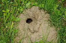 Many hibernating, small-bodied mammals hibernate in simple holes in the ground, though some use complex systems of tunnels and burrows. Mountain pygmy possums in New South Wales, Australia, dig holes in the ground to form hibernacula, with the preferred location being in boulder fields under a layer of snow. During the first few months of hibernation, possums awaken occasionally and leave one hibernaculum in favor of another, seemingly in an effort to find the hibernaculum with the most suitable microclimate.[25] The reddish-gray mouse lemur also wakes and leaves the hibernaculum spontaneously and for brief periods of time. Their hibernacula are located in holes in large trees with varying levels of insulation. However, the range of insulation levels is relatively narrow, as there are often small numbers of suitably large trees.[22] There can be hibernacula differences even within a species. In Columbian ground squirrels, hibernacula size is proportional to the weight of the individual occupying it, with adults having deeper hibernacula than juveniles, unlike black bears. Most juveniles choose to hibernate within 20 meters of their mother's burrow; those that don't have higher mortality rates.[26]