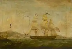 Hibernia departed Portsmouth on 20 November 1818. Adverse winds in the Channel and again off the coast of Australia delayed her voyage with the result that she arrived in Hobart on 11 May 1819 after a transit of 172 days.[1] She had embarked 160 male prisoners, of whom three died on the way.[13] Hibernia continued on to Sydney in June with cabin passengers. Hibernia departed Sydney bound for Calcutta via Batavia.