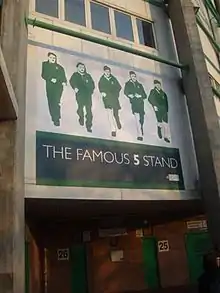 Hibs' most successful era was in the decade following the end of the Second World War, when it was "among the foremost clubs in Britain".[11] The forward line of Gordon Smith, Bobby Johnstone, Lawrie Reilly, Eddie Turnbull and Willie Ormond, collectively known as the Famous Five, was "regarded as the finest ever seen in Scottish football".[11] Each of the Famous Five scored more than 100 goals for Hibs.[11] The north stand at Easter Road is now named in their honour. Smith was signed by Hibs in 1941, while Ormond, Turnbull, Reilly and Johnstone were all signed during 1946. Of the five, only Ormond cost Hibs a transfer fee, £1200 from Stenhousemuir.[27] Reilly, Johnstone, Smith and Turnbull were all signed from youth or junior leagues.[11][28]