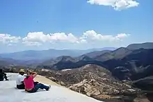 Hierve el Agua (Spanish for "the water boils") is a set of natural travertine rock formations in San Lorenzo Albarradas, Oaxaca, Mexico that resemble cascades of water.[1][2] The site is located about 70 km east of Oaxaca City,[3] and consists of two rock shelves or cliffs which rise between fifty and ninety metres from the valley below, from which extend nearly white rock formations which look like waterfalls. These formations are created by fresh water springs, whose water is over-saturated with calcium carbonate and other minerals. As the water trickles over the cliffs, the excess minerals are deposited, much in the same manner that stalactites are formed in caves.[1] One of the cliffs, called the "cascada chica" (small waterfall) or the Amphitheatre, contains two large artificial pools for swimming as well as a number of small natural pools.[4][5] One of the artificial pools is very near the edge of the cliff.[3]