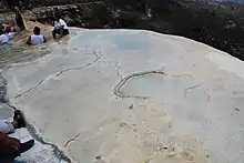 The more easily accessible and more often visited of the two waterfalls is the "cascada chica," also called the Amphitheatre.[2][4] This cliff rises over fifty metres above the valley floor, where there is a natural platform about sixty meters wide.[4] This platform has four springs. The water from three of the four springs is captured by a number of small natural pools and two large artificial pools in which visitors can swim. The lower of the two pools is very close to the cliff edge and was built in 2007.[3] In these pools, the water appears a turquoise green due to the mineral concentration.[3][2] The fourth spring is located closest to the edge and responsible for most of the waterfall rock formation.[3][2] Two of the four springs on the Amphitheatre side rise from the level floor and appear to bubble up, which is the source of the name.[5] The bubbling action of these and some other springs is thought to occur due to construction of underground water currents.[4] This bubbling action leads to the name of the area, Hierve el Agua (the water boils). Water constantly flows out of the springs and the process of depositing the calcium carbonate is ongoing, which can be seen on the walls of the artificial pools.[2]