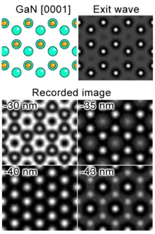 As a result of the interaction with a crystalline sample, the electron exit wave right below the sample φe(x,u) as a function of the spatial coordinate x is a superposition of a plane wave and a multitude of diffracted beams with different in plane spatial frequencies u (spatial frequencies correspond to scattering angles, or distances of rays from the optical axis in a diffraction plane). The phase change φe(x,u) relative to the incident wave peaks at the location of the atom columns. The exit wave now passes through the imaging system of the microscope where it undergoes further phase change and interferes as the image wave in the imaging plane (mostly a digital pixel detector like a CCD camera). It is important to realize, that the recorded image is NOT a direct representation of the samples crystallographic structure. For instance, high intensity might or might not indicate the presence of an atom column in that precise location (see simulation). The relationship between the exit wave and the image wave is a highly nonlinear one and is a function of the aberrations of the microscope. It is described by the contrast transfer function.