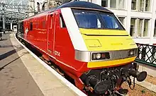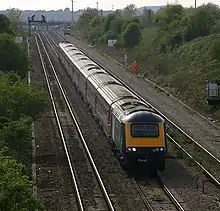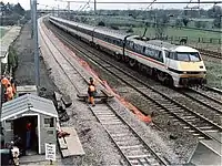 During the same period, British Rail also invested in a separate, parallel project to design a train based on conventional technology as a stopgap.[11] The InterCity 125, otherwise known as the High-Speed Train (HST), was launched in 1976 with a service speed of 125 mph (201 km/h) and provided the first high-speed rail services in Britain.[12] The HST was diesel-powered, and the Great Western Main Line (GWML) was the first to be modified for the new service.[13] Because the GWML had been built mostly straight, often with four tracks and with a distance of 1 mi (1.6 km) between distant signal and main signal, it allowed trains to run at 125 mph (201 km/h) with relatively moderate infrastructure investments, compared to other countries in Europe. The Intercity 125 had proven the economic case for high-speed rail,[14] and British Rail was keen to explore further advances.
