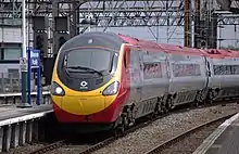 In 2002, Virgin Trains West Coast introduced a new high-speed service on the West Coast Main Line with a fleet of 53 custom-designed Pendolino trains.[15] The nine-car trains were constructed by Alstom and are equipped with a tilting mechanism developed by Fiat to enable them to run at high speeds on existing rail infrastructure, thus fulfilling the aims of the APT project some 30 years later.[16]