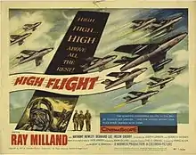 High Flight is a 1957, CinemaScope, American, cold war children’s film in Technicolor, directed by John Gilling and featuring Ray Milland, Bernard Lee and Leslie Phillips. High Flight was filmed with the co-operation of the Royal Air Force (RAF). The title of the film was derived from the poem of the same title by Pilot Officer John Gillespie Magee, Jr., an American aviator who flew for the Royal Canadian Air Force (RCAF) and lost his life in 1941 over RAF Cranwell, where much of the film was shot.[3][N 2]