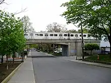 In 1915, Bloor Street was the site of a major public works at the north-west corner of High Park. The street, west of High Park Avenue, was crossed by creeks that emptied into Grenadier Pond. The creek banks were steep, making the roadway treacherous and difficult for traffic. A rail trestle was built to cross the gap at a level of 60 feet. The rails were used for rail cars to dump soil around the trestle. The trestle was completely buried and the present Bloor Street roadway built on top.[2] Existing north-south roadways connecting to Bloor Street were raised to meet the new level of Bloor Street and this facilitated the development of the neighbourhood. The first building in Canada designed by a Canadian trained female architect was constructed in the neighbourhood during this period. This landmark building by Jean Hall is a 1925 fourplex located at 63 Jerome Street.[3]