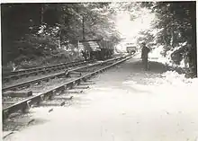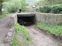High Peak Junction lies at the bottom of the steep Sheep Pasture incline (some 1,320 yards in length at a gradient varying between 1:8 and 1:9), and following a runaway in 1888 a catch pit was constructed, the two lines passing either side of it. In this accident (of which there are a number of varying versions), it would seem that a wagon loaded with lime and a brake van containing gunpowder broke free from a train, hurtling down the incline at speeds of up to 120 mph. Failing to take the bend at the bottom, they then ran across the site, jumping across both the canal (damaging the bank) and the double tracks of the Midland Railway before one of the canisters exploded in the adjacent field. Minutes later the London passenger train passed.[8][9] Wreckage seen in the catch pit today dates from a further runaway in the 1950s.[10]