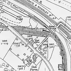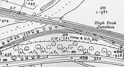 On Ordnance Survey maps of 1880 and 1884 the site is labelled "Railwayend", as it was until the Junction line was built in 1852. (To canal users, the swing bridge at this point was known as Railwayend bridge.) From at least 1900 onwards maps label this site "High Peak Junction" (or "Highpeak Junction").[15] It is so labelled on the 1899 edition of the 25" OS map (revised 1896), where the former term refers to the main line junction, while the latter refers to the wharf area. The 1884 edition of the 25" OS maps also shows a "Junction Inn" on the towpath side opposite the wharf, though by the 1899 edition this had disappeared due to a realignment of the main line.