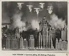 High Treason is a 1929 film[1] based on a play by Noel Pemberton Billing. It was directed by Maurice Elvey, and stars James Carew, Humberstone Wright, Benita Hume, Henry Vibart, Hayford Hobbs, Irene Rooke, and Jameson Thomas.[2] Raymond Massey makes his first screen appearance in a small role. The film was initially produced as a silent but mid-way during production, Elvey was pushed by the studio to add sound to the film in order to cash in on the talkies. Although a third of the film was filmed in sound, Elvey maintained much of the silent footage and dubbed over the dialogue for shots that were originally silent, with Elvey himself voicing some of the minor characters, which he admitted when interviewed by the Mantioba Free Press shortly after the film was released in the US [3] Likewise, BIP's Blackmail, directed by Alfred Hitchcock was also turned into a sound picture mid-way during production (concurrently when High Treason was also in production) and many of the silent scenes used dubbed dialogue and sound effects in a similar fashion to High Treason.