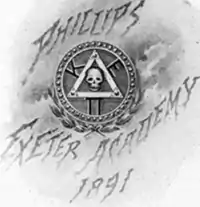 K.E.P., or Kappa Epsilon Pi, founded at Phillips Exeter Academy in 1891, was one of several fraternities at PEA with the only one having a Preparatory Order of Death attached to it. Exeter's order is called "Skull and Wreath". It tapped 13 members and has a badge which is expensively crafted. It is gold with a skull and laurel wreath creation, incorporating seed pearls, rubies and emeralds. America's oldest high school secret society is the Golden Branch of Phillips Exeter Academy, founded in 1818 as a successor to the Rhetorical Club founded in 1807, now the Daniel Webster Debate Society.[3][4] Oculus et Comibus also known as O.E.C. or Order 23 is a group at Phillips Exeter claiming to have diverged from Golden Branch. Though administratively suppressed in the 1950s, there remains at least one secret society at Exeter. Exeter is now coeducational.