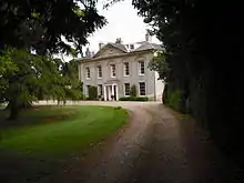Higham Hall is a Grade II listed building situated next to St Mary's Church. It dates from the early 19th century with a 17th-century or earlier rear range altered in the 19th century. The front range is of white brick, partly pebble-dashed at the rear. The rear range is of red brick in English bond, with an inner face pebble-dashed, and an outer wall rendered. The roof is of slate. The front range is of two storeys and an attic. It has five bays with a slightly lower rear range to the right, forming an L-plan. The entrance and window bays are set in a two-storey arcade with impost bands leading to segment arches of gauged brick. There is a central Doric porch. The sash windows have glazing bars in reveals with sills under cambered gauged brick arches. The centre three bays have a pediment. There is an overhanging hipped roof with wooden bracketed eaves. There are a pair of dormers with sashes.[6]