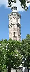 The High Bridge Water Tower, in the park between West 173rd and 174th Streets, was built in 1866–1872 to help meet the increasing demands on the city's water system. The 200-foot (61 m)-tall octagonal tower was designed by John B. Jervis in a mixture of Romanesque Revival and neo-Grec styles, and was accompanied by the 7-acre (2.8 ha) Highbridge Reservoir. The High Bridge system was inaugurated in 1872, and reached its full capacity by 1875.[33] With the opening of the Croton Aqueduct, the High Bridge system became less relied upon; during World War I it was taken out of service when sabotage was feared.[33] In 1949 the tower was disconnected from the system,[33][54] and a carillon, donated by the Altman Foundation, was installed in 1958.[33] The tower's cupola was damaged by an arson fire in 1984. The tower and cupola were rehabilitated and restored in 1989–1990.[33] The High Bridge Water Tower was designated a New York City landmark by the Landmarks Preservation Commission in 1967. The High Bridge Water Tower underwent a 10 year, $5 million renovation, and reopened to the public for scheduled tours in November 2021. [55] Tours are free through NYC Parks Department and usually take place several times a month.