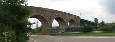 The 15-mile (24 km) Inverness & Nairn Railway was given permission for a line between Inverness and Nairn, together with a 1⁄2-mile (0.80 km) branch to Inverness Harbour, on 24 July 1854.[4] [5] The line opened ceremonially on 5 November 1855 when a train of thirty vehicles, mainly goods wagons fitted with seats, made a return journey. Intermediate stations opened at Culloden (later Allanfearn), Dalcross, Fort George (later Gollanfield Junction) and Cawdor.[lower-alpha 1] Initially three trains a day ran between Inverness and Nairn, horse-drawn coaches providing a link to Keith and thereby Aberdeen via the Great North of Scotland Railway.[7] The Inverness & Nairn planned an extension as far as Elgin; between Elgin and Keith the River Spey needed to be crossed. The GNoSR offered £40,000 towards a bridge and the Inverness and Aberdeen Junction Railway (IAJR) was given authority for a line from Nairn and Keith in July 1856. A temporary station at Dalvey, west of the River Findhorn, opened on 22 December 1857, to close when the line extended to Elgin on 25 March 1858. Keith, and the GNoSR, was reached on 18 August 1858.[8] Three services a day ran between Inverness and Aberdeen, Aberdeen being reached in between 5 hours 55 minutes to 6 hours 30 minutes.[9] The Spey Bridge was unfinished when the line opened, so initially passengers walked across the adjacent road bridge as the locomotive was detached and crossed before the carriages were hauled over by ropes. The Inverness and Aberdeen Junction absorbed the Inverness & Nairn in 1861.[10]