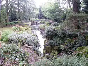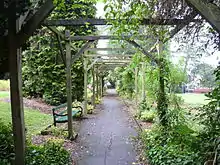 The park was opened in 1931 in the grounds of Highlands House which already had a well-established set of gardens. The entrance is on the corner of Leicester Road and Abbotts Road. The gardens consist of a lawn terrace with a pergola walk on the north side and water and rock features on the western side. All four sides of the gardens include mature trees. The rockworks were probably the work of James Pulham and Son, around 1871, of nearby Broxbourne. An aviary by the name of the "Bird World Display Centre" existed on the northern edge of the gardens until the late 1990s.[1] The gardens are maintained by the London Borough of Barnet with help from the Friends of Highlands Gardens.[2]