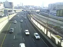 Highway 20, more commonly known as the Ayalon Highway,[1] or simply Ayalon (Hebrew: נתיבי איילון, pronounced: Netivei Ayalon, lit. "Ayalon lanes"), is a major intracity freeway in Gush Dan, Israel. The road runs along the eastern border of central Tel Aviv from north to south (with a planned east-west branch as well) and connects all of the major highways leading to the city—such as Highway 4 from Ashdod and the Southern regions, Highway 2 from Haifa and the Northern regions, Highway 5 from the East, and Highway 1 from Jerusalem and the Southeast. The Ayalon Highway is heavily used; on an average day almost 600,000 vehicles enter the freeway.[2] It consists of a multi-lane highway with a multi-track railway located between the opposite travel lanes. Some of the highway's route is along the Ayalon River, hence its name.