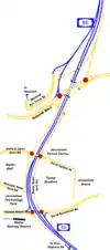 The road follows a south-north path that connects key neighborhoods and commercial areas, as well as several city arteries and national routes. Beginning at the Rosmarin Interchange (formerly the Tunnels Junction) of the Gush Road in Gilo, the road arcs north-westward through Gilo, Beit Safafa, and Sharafat turning northward through Malha. Passing Golomb Blvd, the road travels below a high ridge to the west on which sits the Holyland Park building complex. To the east is Emek Hatzva'im (Gazelle Valley), a green zone that was previously leased to Kiryat Anavim and Ma'ale HaHamisha and used for agricultural purposes.[1] Further on, the path was excavated to create a depressed roadway between Bayit Vegan, Givat Mordechai, Ramat Beit HaKerem and Givat Ram. This section is equipped with noise barriers and speed cameras.[2]